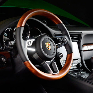 Las molduras alrededor de las ventanas laterales son de aluminio. Como homenaje a los legendarios rines Fuchs, que caracterizaron la imagen del 911 durante décadas, el modelo único está equipado con neumáticos deportivos Carrera de 20 pulgadas en el diseño clásico. En el interior, los expertos del taller exclusivo de Porsche han utilizado todas las opciones de cuero que están disponibles para el 911. El panel del interruptor tiene acentos de caoba. Estos detalles distinguidos son también un homenaje al primer 911. En el interior, los expertos de Porsche Exclusive emplearon todas las opciones de cueros disponibles para el 911. El panel del interruptor de encendido tiene acabados en caoba. Estos detalles distintivos son también un homenaje al primer 911.